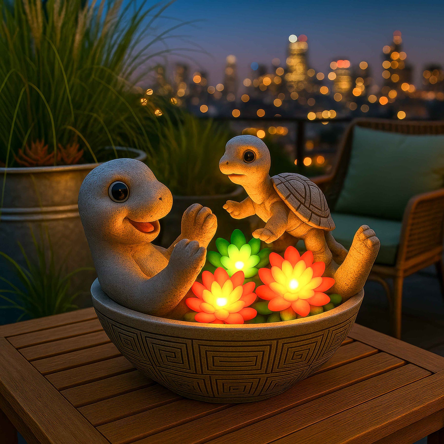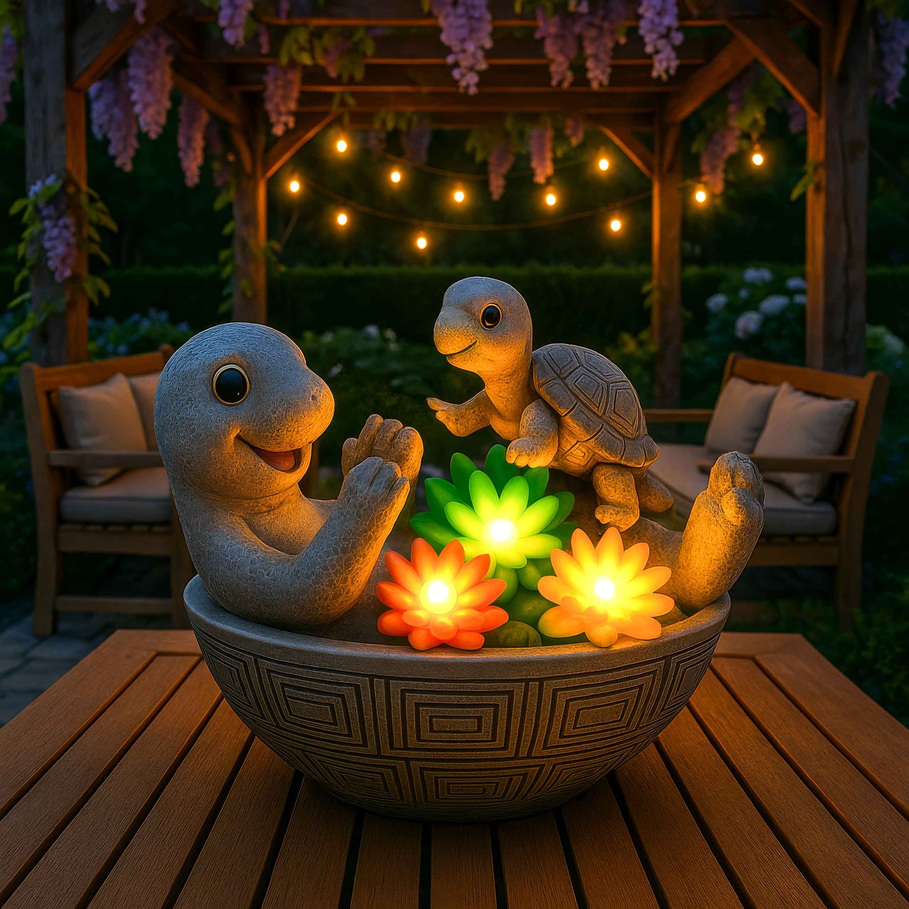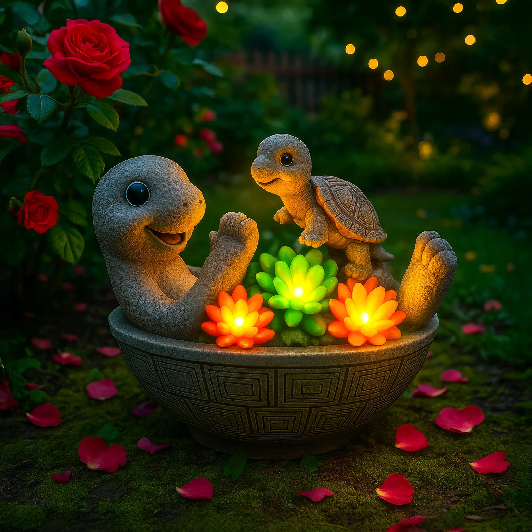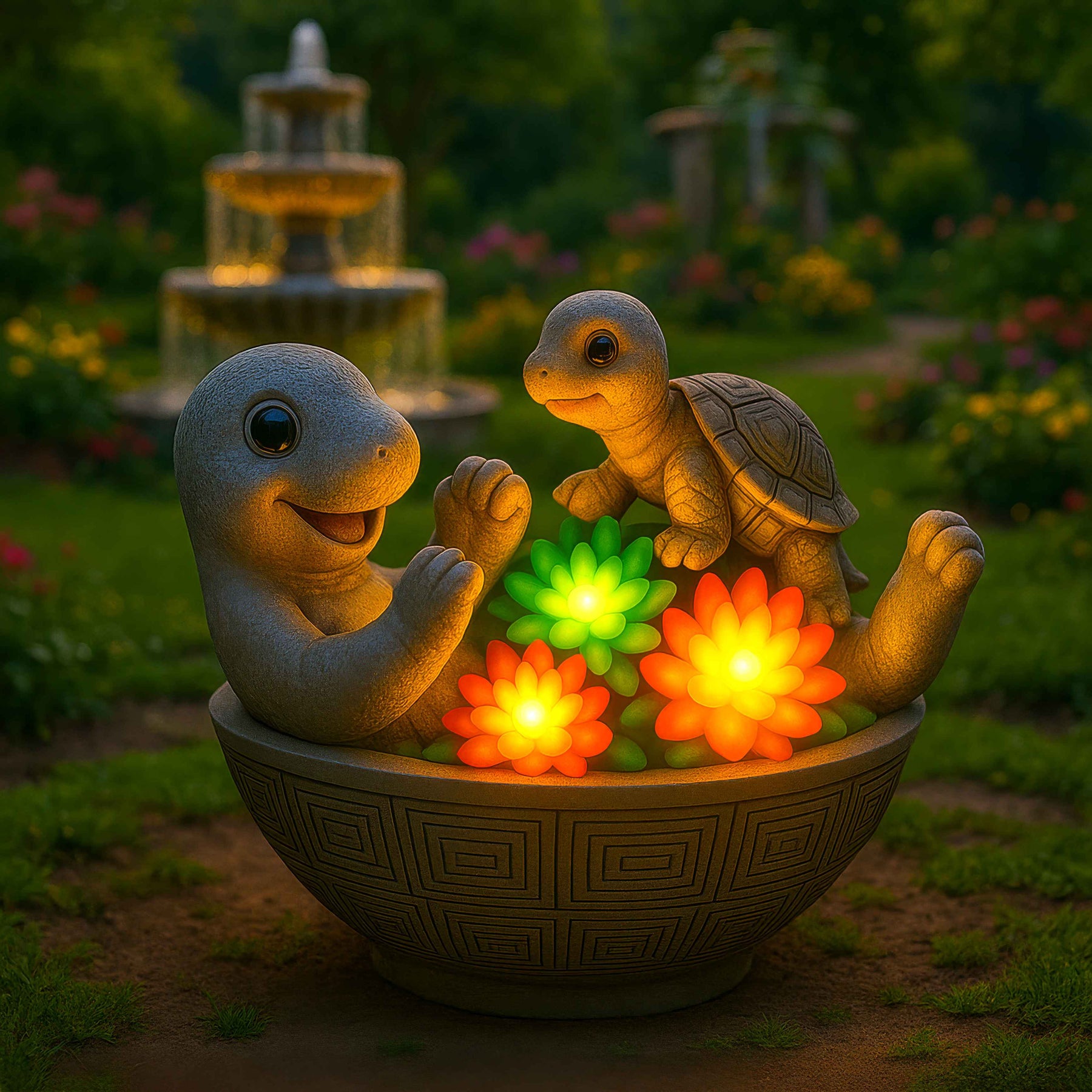 Diese entzückenden leuchtenden Schildkröten sitzen zusammen in einer Schale voller bunter Lotusblumen, die sanft leuchten.