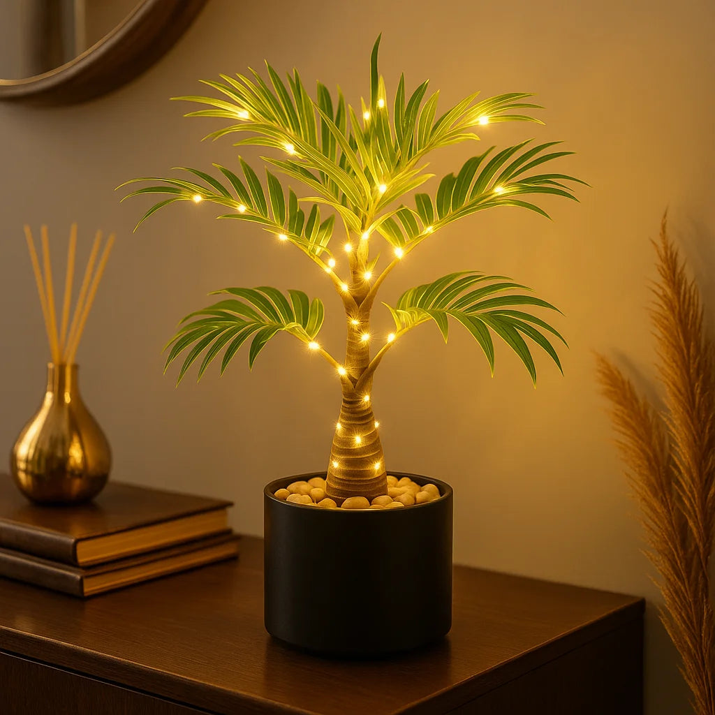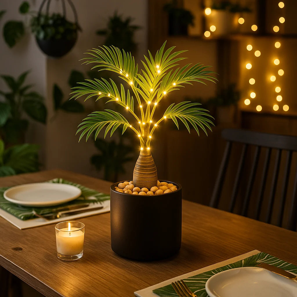 Die eleganten Palmenblätter mit dezenter LED-Beleuchtung erzeugen ein warmes Licht und eine entspannende Inselatmosphäre.