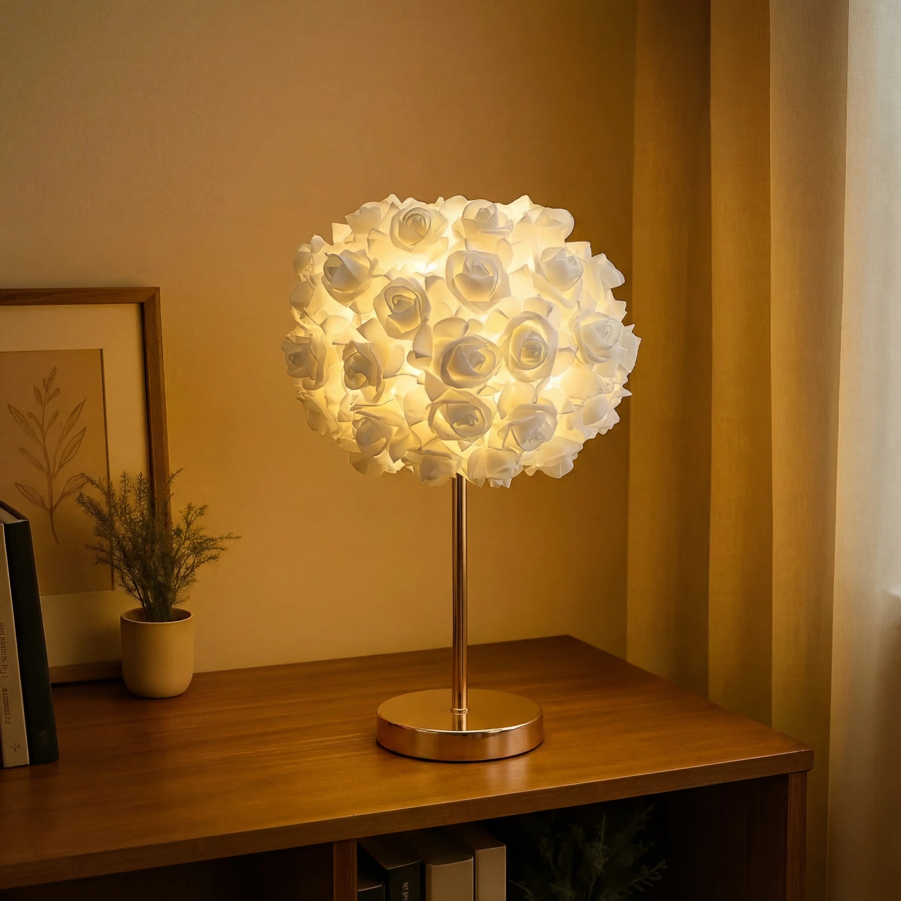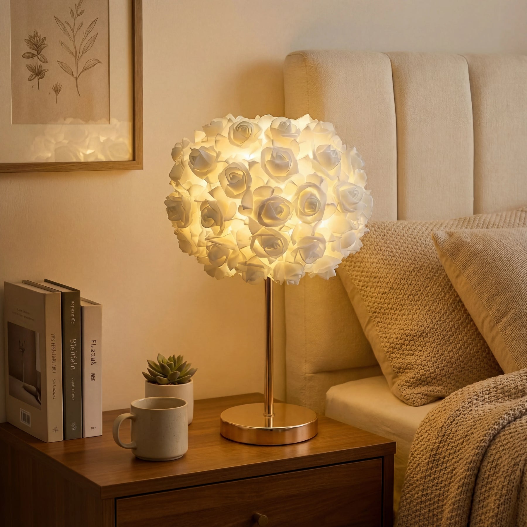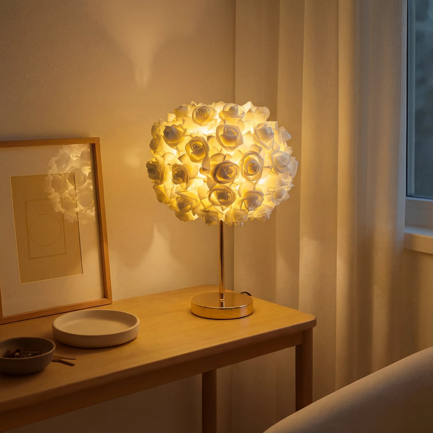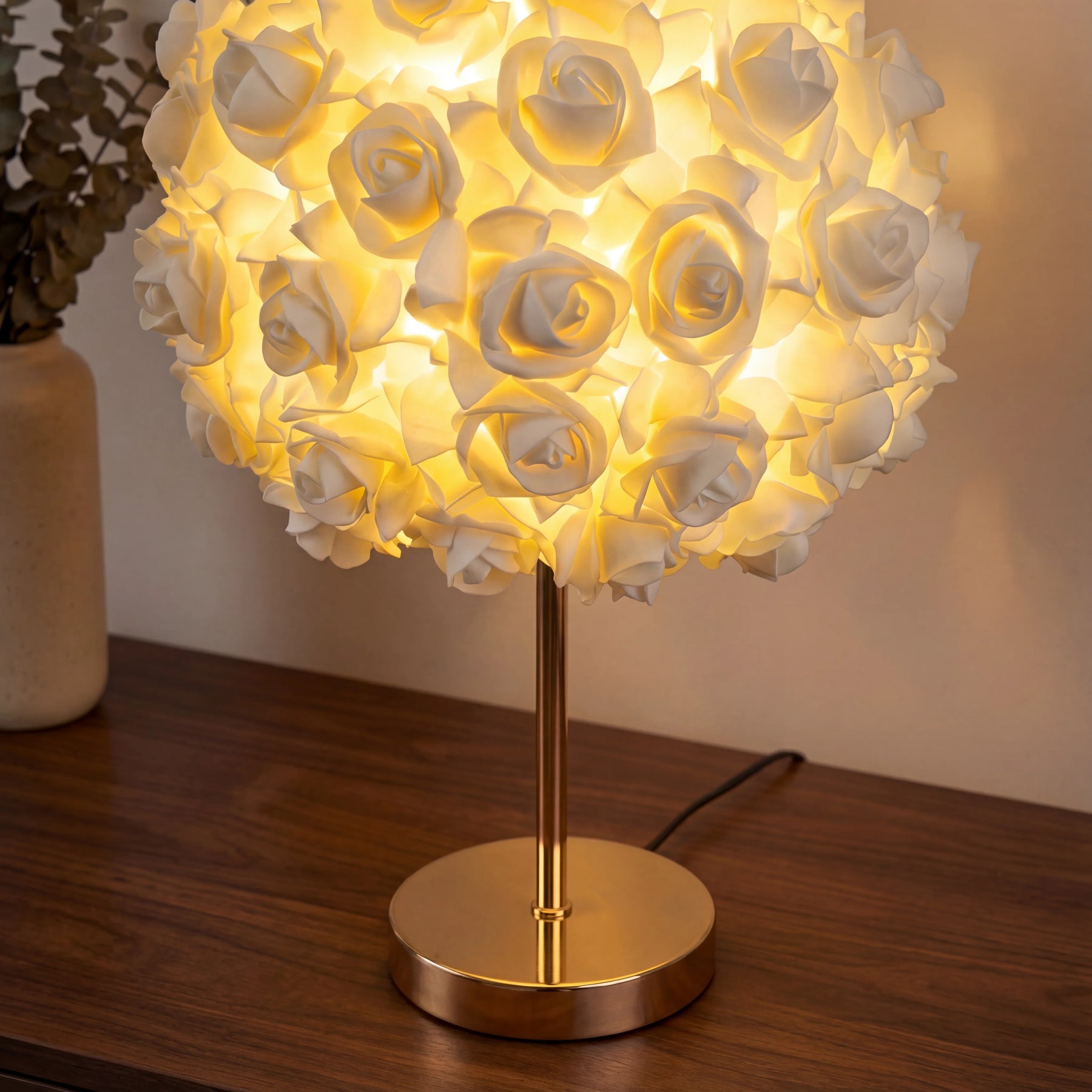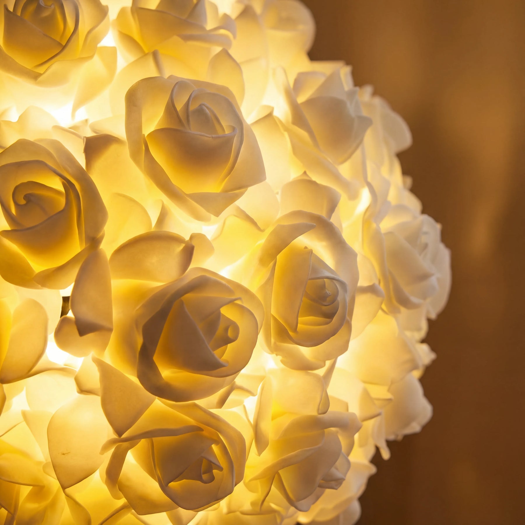 De lamp bestaat uit tientallen prachtig vormgegeven rozen die zacht oplichten, waardoor een luxe en dromerige ambiance ontstaat.