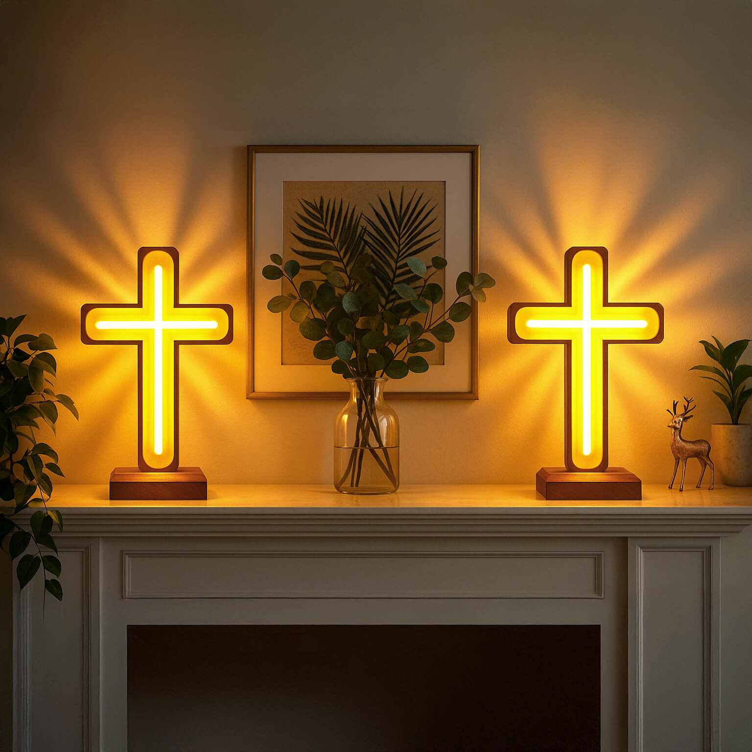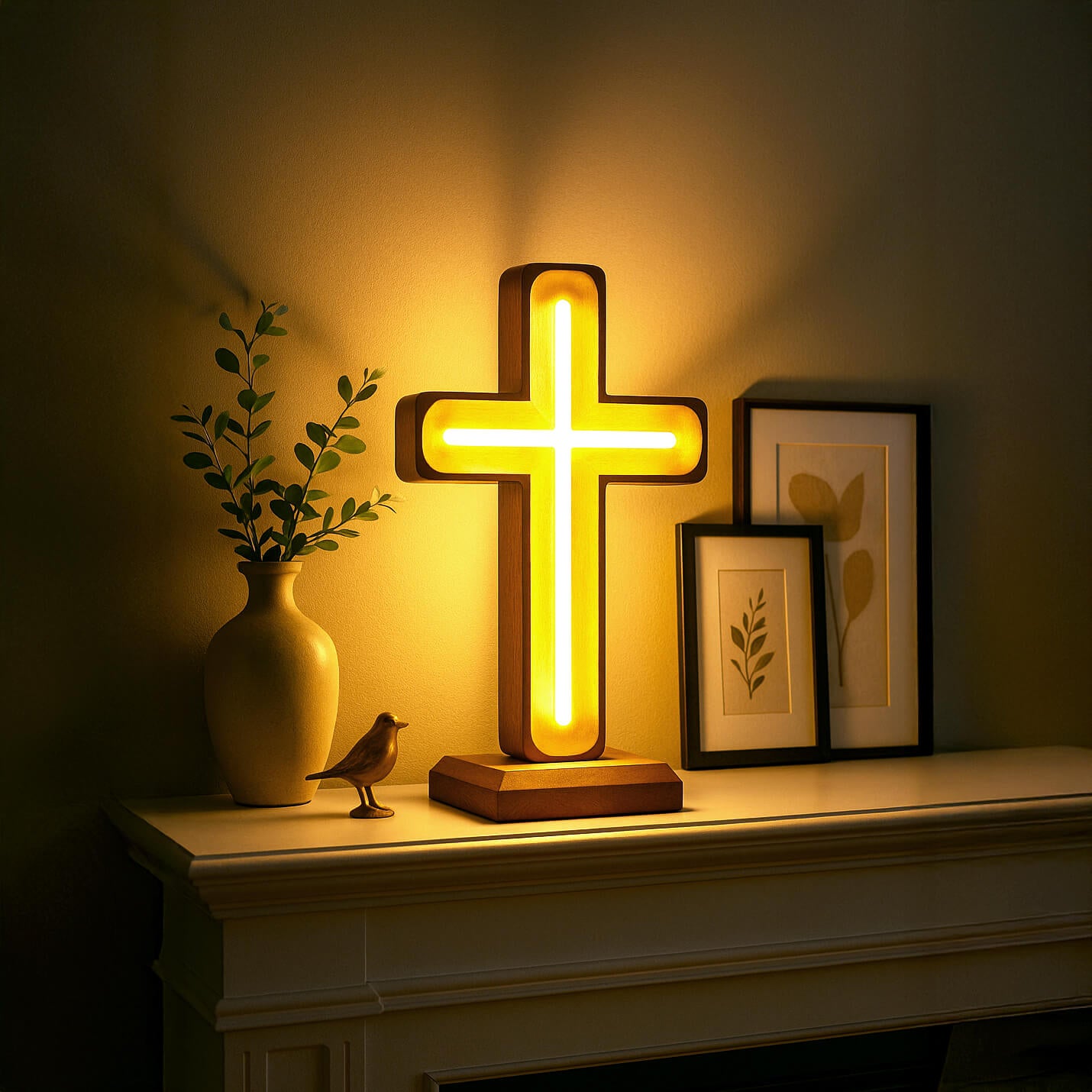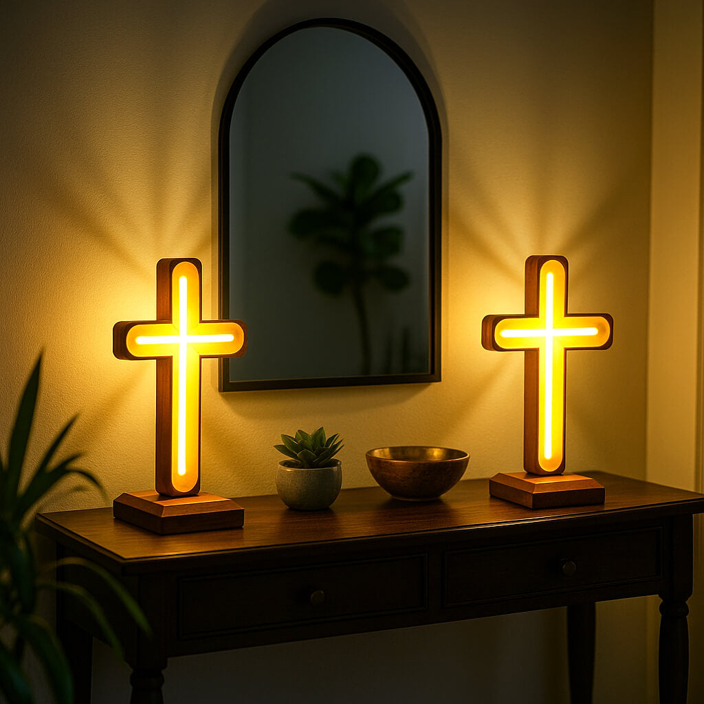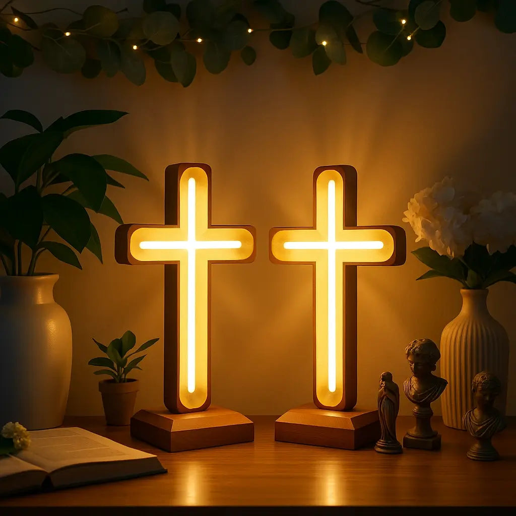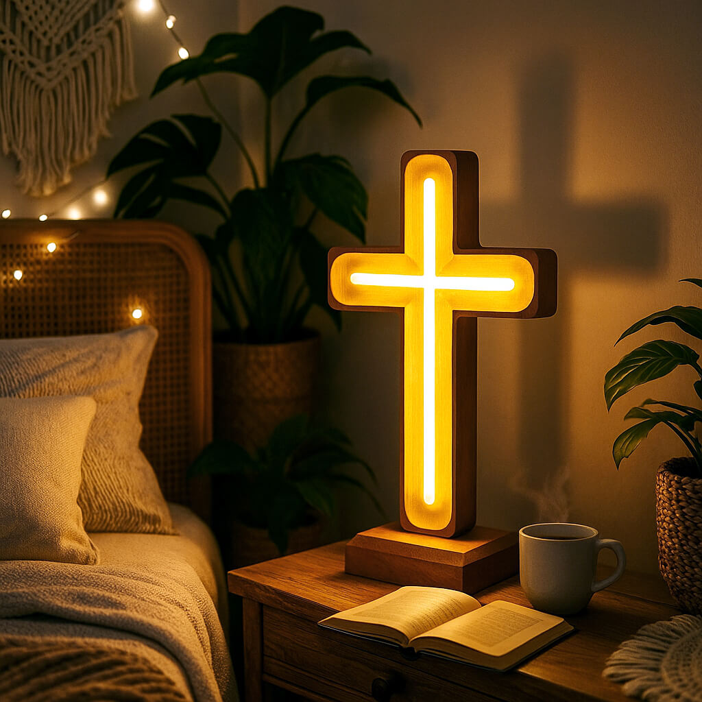 Ein beleuchtetes Symbol des Friedens und des Glaubens – bringt Wärme und Gelassenheit in jeden Raum.